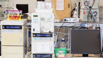 Auch die HPLC der Firma Shimadzu dient der Hochleistungs-Flüssigkeitschromatographie. Aktuell bestückt mit Säule: Phenomenex Rezex ROA-Organic Acid H+ [8%]. Aktuelle Applikation mit Analyten: FOS Bestandteile dieses Hplc-Systems sind: CBM-20A LITE, LC-20AD Pump, CTO-20AC, DGU-20A5R, RID-10A (CE) 230V, SPD-M30A und SIL-20AHT Autosampler.