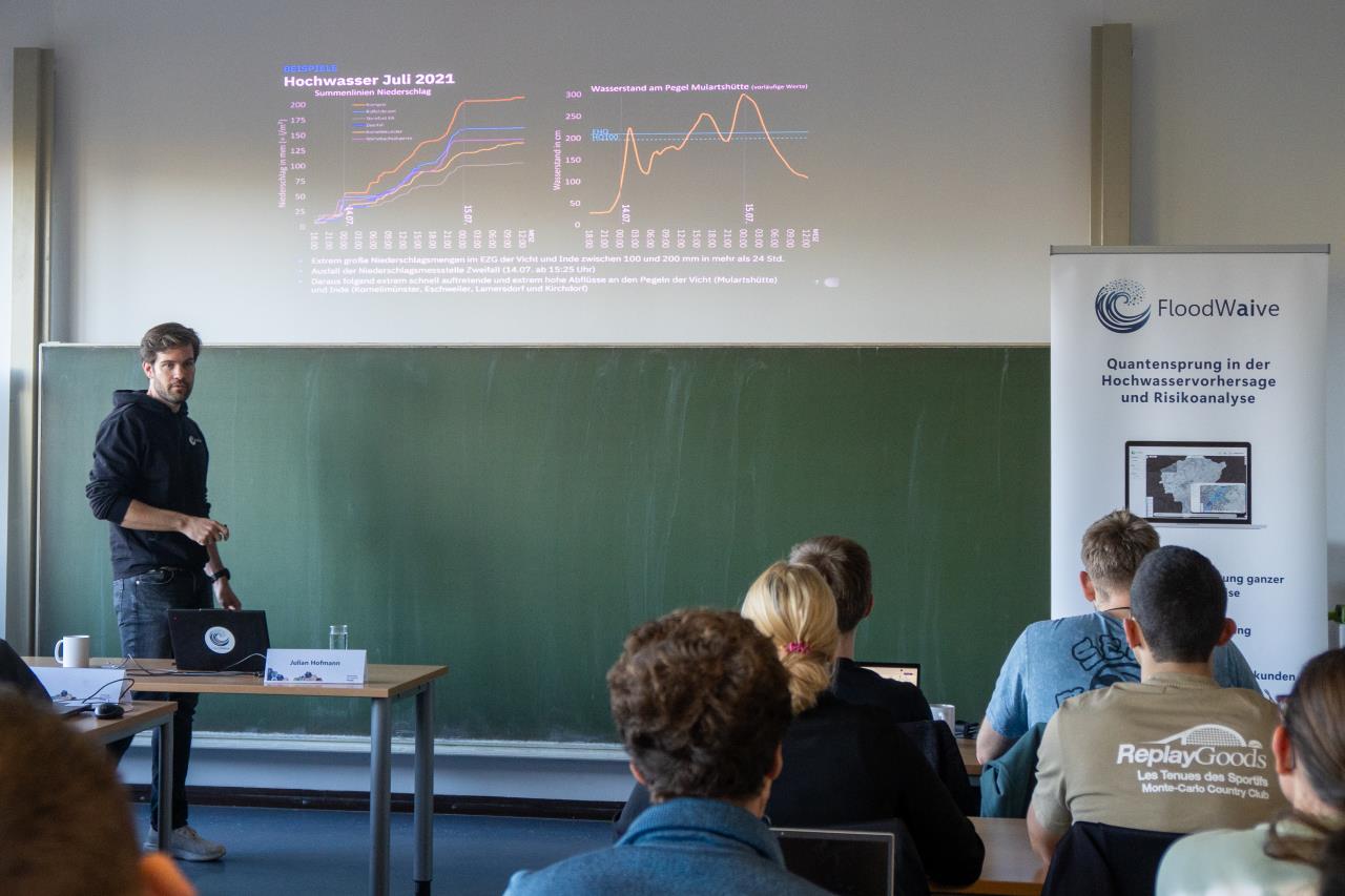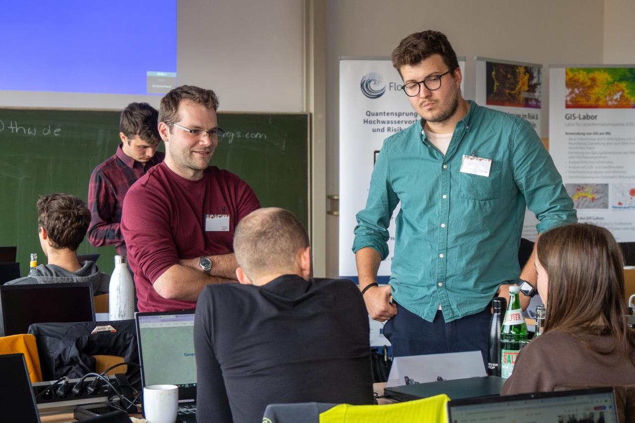 Der zweite Tag stand im Zeichen des Hochwasserrisikos. Das Team von FloodWaive führte in die integrale Starkregenanalyse und hydrodynamische Modellierung ein. In einem Workshop wurde der Weg vom Radarbild bis zur dynamischen Lagekarte für operative Hochwasserprognosen nachvollzogen. Die Teilnehmenden konnten mit dem DeepWaive RiskAnalyzer verschiedene Starkregenereignisse simulieren lassen und die Auswirkungen analysieren. Am Nachmittag stellte das Virtual Operations Support Team (VOST) des THW seine Arbeit vor, anschließend erstellten die Teilnehmenden in einem Workshop ein eigenes Dashboard zur digitalen Lagekartierung in einem Hochwasserszenario.