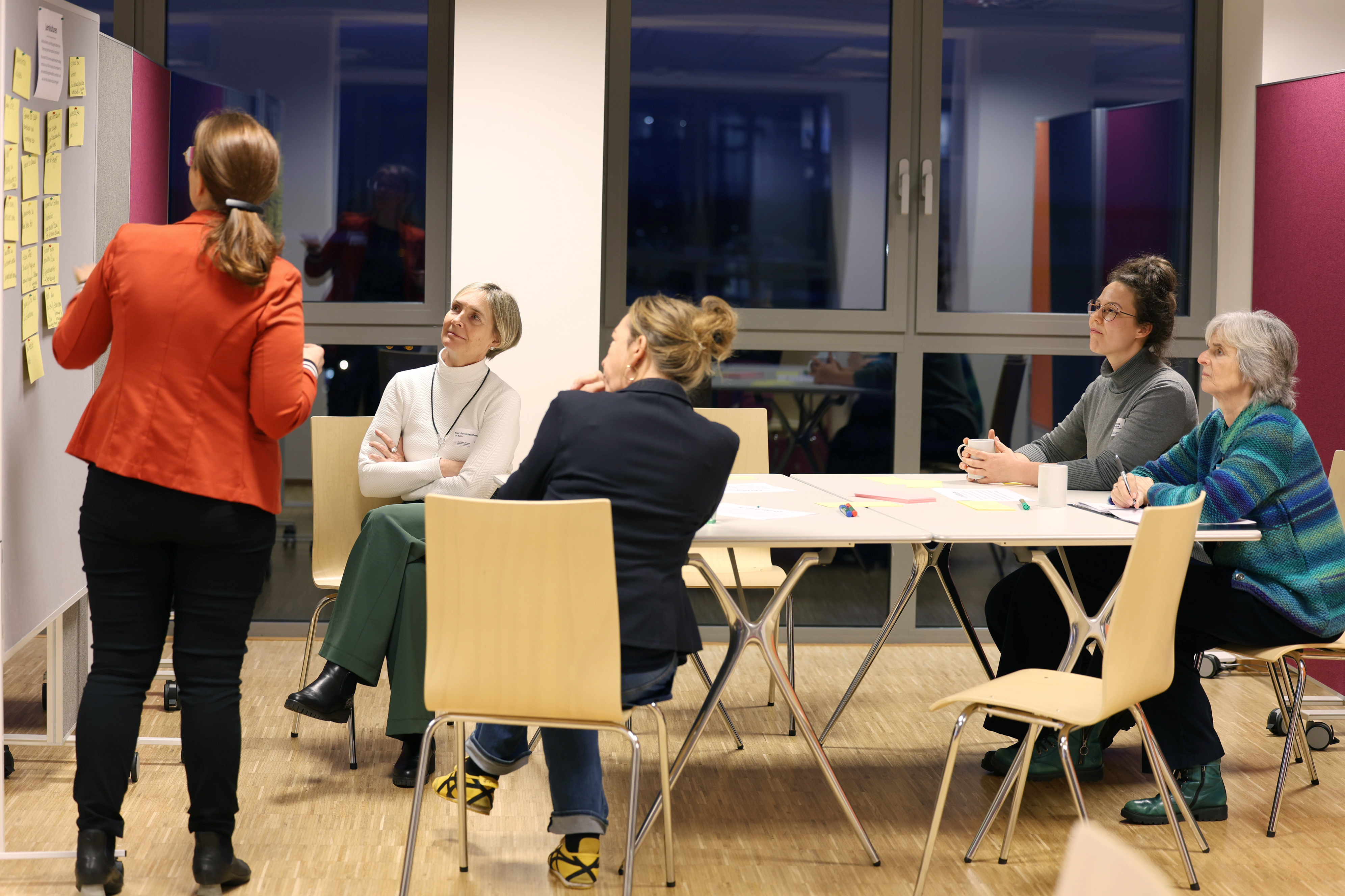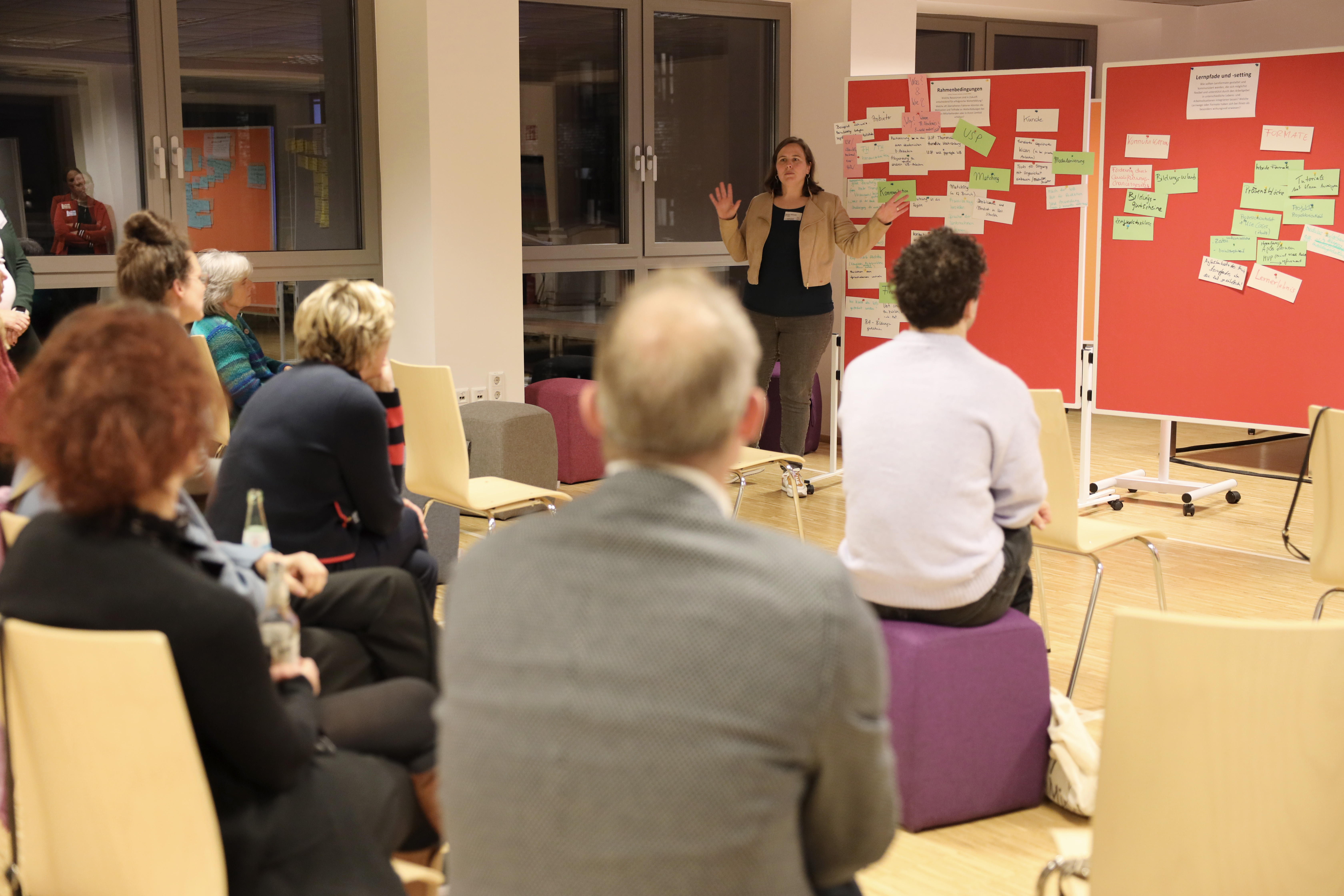 Bevor Ilona Arcaro, Leiterin der wissenschaftlichen Weiterbildung und stellvertretende Projektleiterin, die Sitzung mit einem Wrap up abrundete, hatten die Anwesenden die Möglichkeit, dem Projektteam auf einer Pinnwand Impulse zu einigen Leitfragen zu hinterlassen, darunter: Wo braucht es radikalere Veränderungen im Projekt, um Lernkultur und Weiterbildung im Rheinischen Revier spürbar zu transformieren? Welche Veränderungen würden aus Ihrer Sicht den größten positiven Unterschied machen? Im lockeren Ausklang endete die Sitzung nach 3 Stunden gegen 18 Uhr.