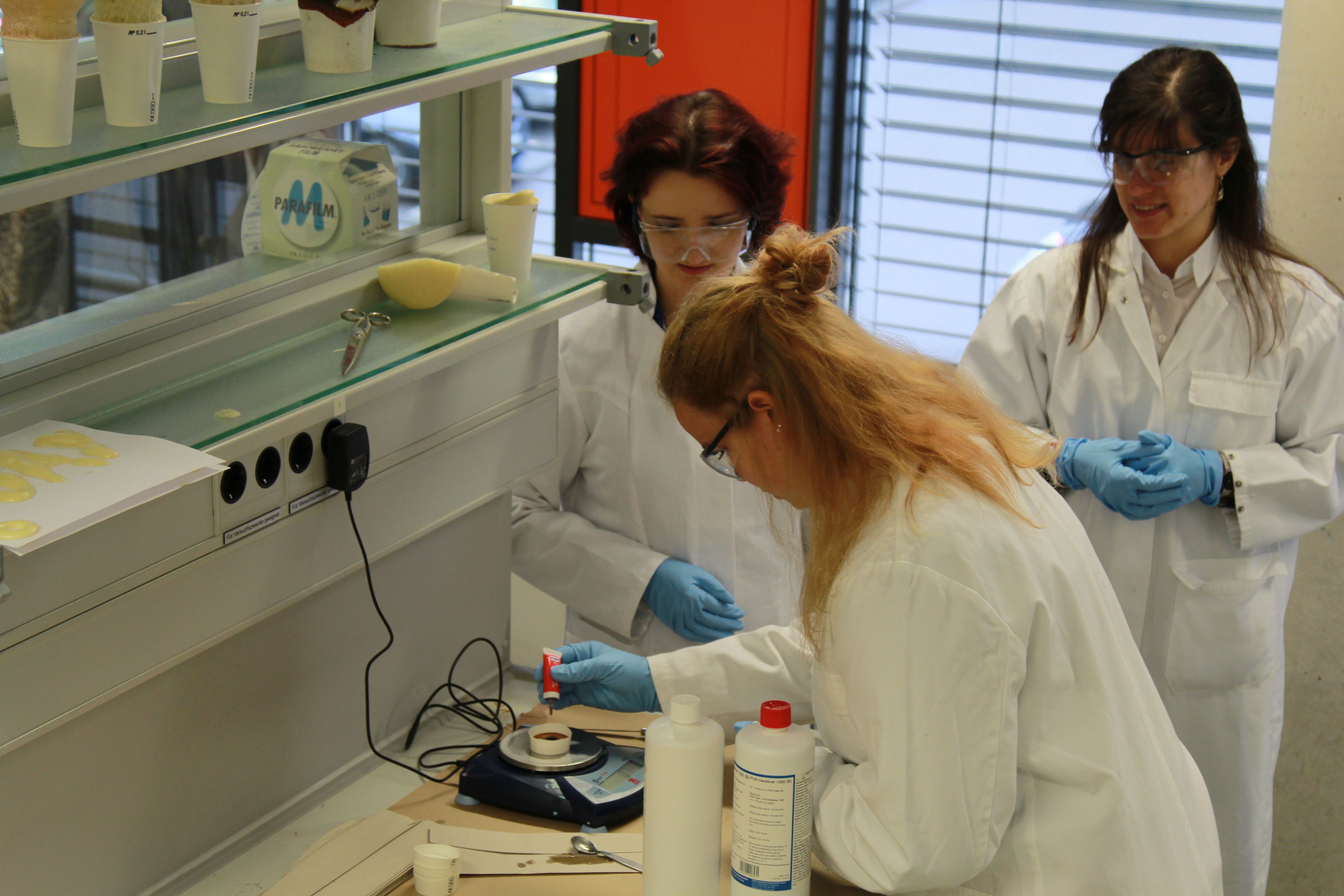 Präzise abwiegen und sorgfältig mischen, nur dann erhält man den gewünschten Schaum. Die TH-Mitarbeiterinnen Anja Senne und Dr. Konstantina Harraß begleiten den Prozess. (Bild: Manfred Stern / TH Köln)