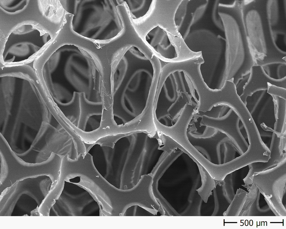 Im Rasterelektronenmikroskop wird ästhetische Struktur eines Spülschwamms erkennbar. (Bild: Institut WAM, TH Köln)