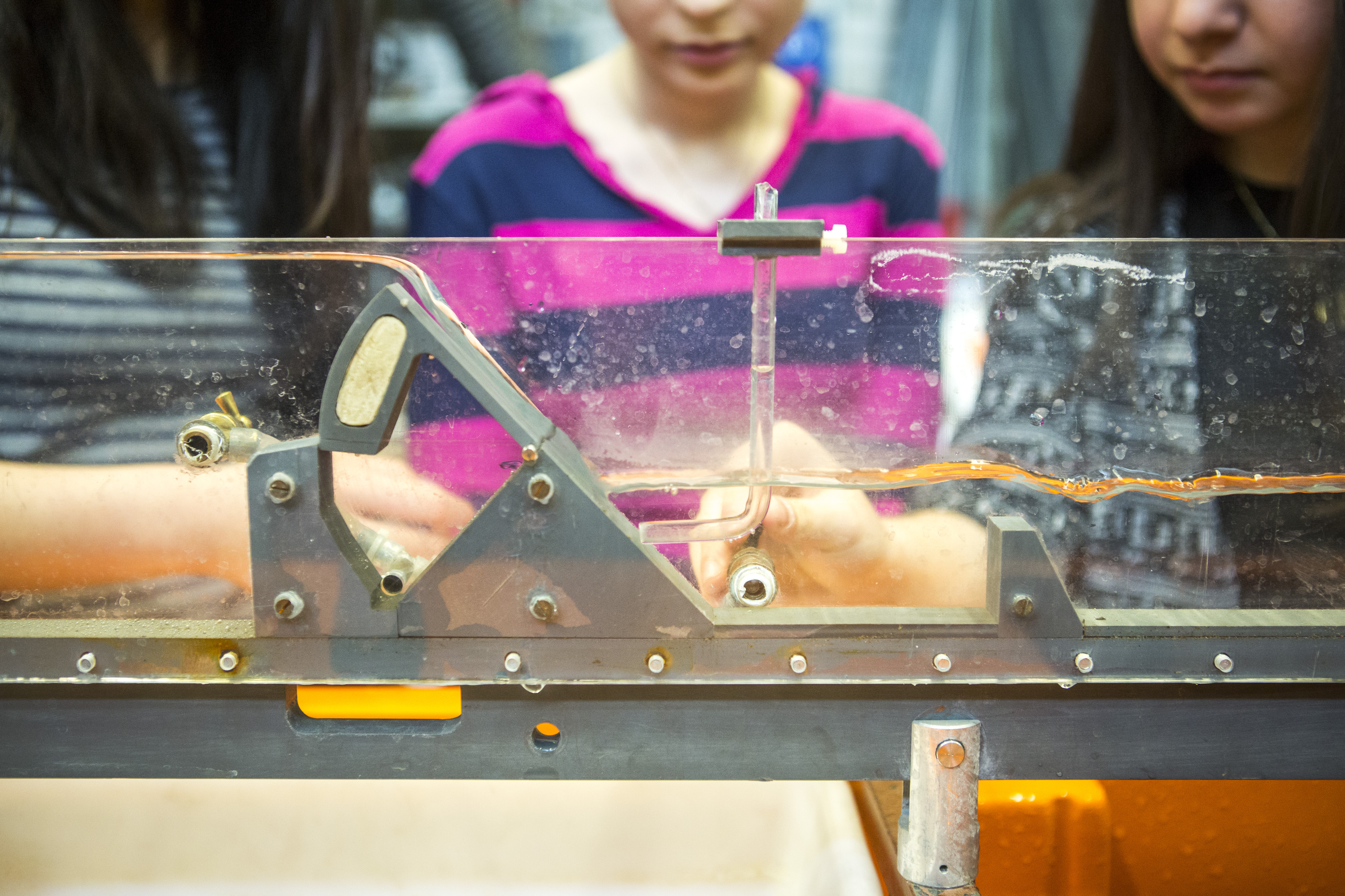 Reinschnuppern: Nach einer Einführung zum Thema "Was machen eigentlich Bauingenieurinnen?" erlebten die Schülerinnen eine Demonstration der Großmodelle des Labors für Wasser und Umwelt. (Bild: Heike Fischer/TH Köln)