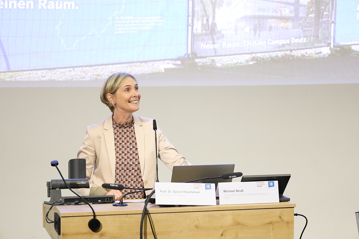 Prof. Dr. Sylvia Heuchemer, Präsidentin der TH Köln, begrüßte die Gäste und betonte die besondere Chance, einen zeitgemäßen Campus zu gestalten, der den Anforderungen von Studium, Lehre und Forschung gerecht wird. Gleichzeitig wandte sie sich ausdrücklich an die Anwohnenden und unterstrich die Bedeutung einer guten Nachbarschaft. (Bild: Bastian Rodowski / Bau- und Liegenschaftsbetrieb NRW)
