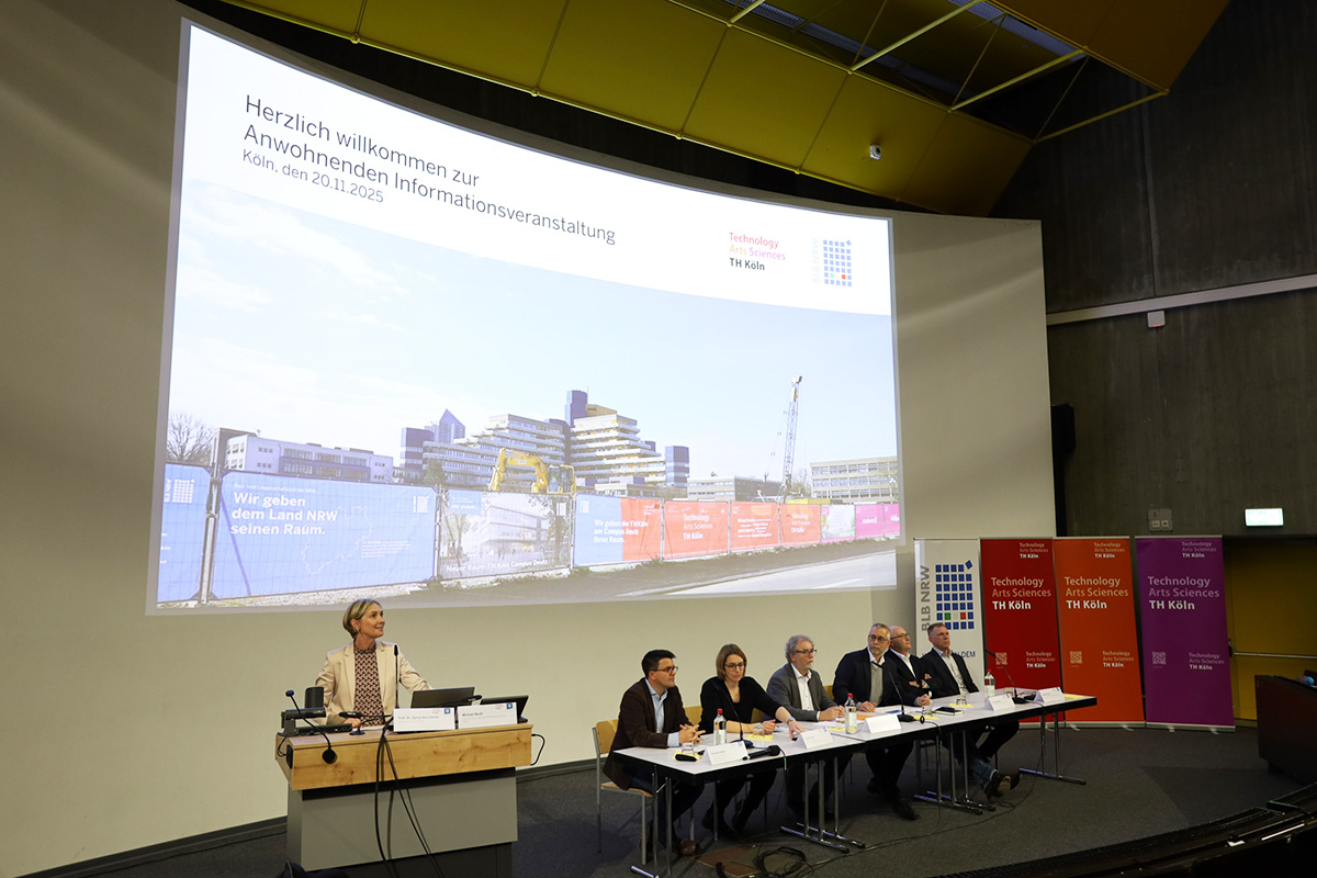 Über den aktuellen Stand des Bauvorhabens Neubau Campus Deutz sowie die Maßnahmen der kommenden Jahre informierten der Bauherr BLB NRW und die TH Köln am 20. November 2025 im Audimax. Rund 80 Interessierte – darunter Studierende, Lehrende und Anwohnende – nahmen an der öffentlichen Informationsveranstaltung teil. Im Anschluss an die Vorträge wurden zahlreiche Fragen aus dem Publikum beantwortet.