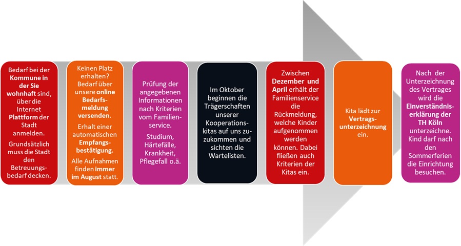 Die TH Köln bietet Studierenden und Beschäftigten die Möglichkeit sich für Belegplätze zu bewerben. Für die Bewerbung ist es Grundvoraussetzung, sich vorher in der Stadt in der man wohnhaft ist, um einen Einrichtungsplatz zu bemühen. Bitte nutzen Sie das Formular "Bedarfsanmeldung Belegplatz" um Ihren Betreuungsbedarf zu melden. Beachten Sie dabei, dass die Bewerbung auf einen Belegplatz keine Platzgarantie darstellt. Zu jedem Kitajahr werden immer nur wenige Plätze frei und der Bedarf ist weitaus höher als das Platzangebot.