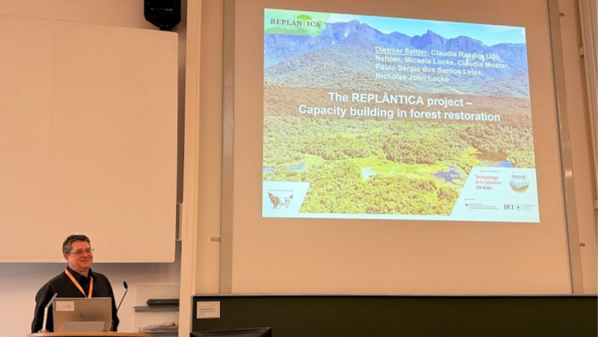 REGUA und die TH Köln arbeiten im REPLÂNTICA-Projekt zusammen, um das Know-how der Wiederbewaldung an sechs Zielgruppen wissenschaftlich fundiert und praxisnah weiterzugeben. Dietmar Sattler, Doktor der Botanik und Ökologie sowie wissenschaftlicher Berater des Vorhabens, stellte das Erfolgsrezept des Trainingsprogramms vor. (Bild: Luíza Zanonato)