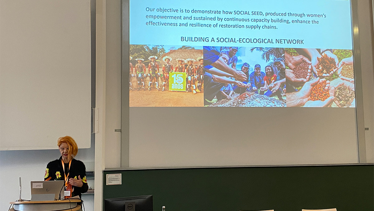 Der zweite Teil der Session startete mit einem Vortrag, der sich mit der Stärkung der Rolle der Frau in Amazonien und der Mata Atlântica befasste. Fatima Pina-Rodrigues, Professorin für Waldbau an der Universität São Carlos, Brasilien und Gründerin des Netzwerks für den Anbau von tropischen Samen und Setzlingen (REMAS), zeigte in eindrucksvollen Bildern, wie sie und Kolleg*innen durch die Gründung von Samen-Netzwerken die Stärkung von indigenen Frauen und Frauen in ländlichen Gebieten Brasiliens fördern. (Bild: Luíza Zanonato)