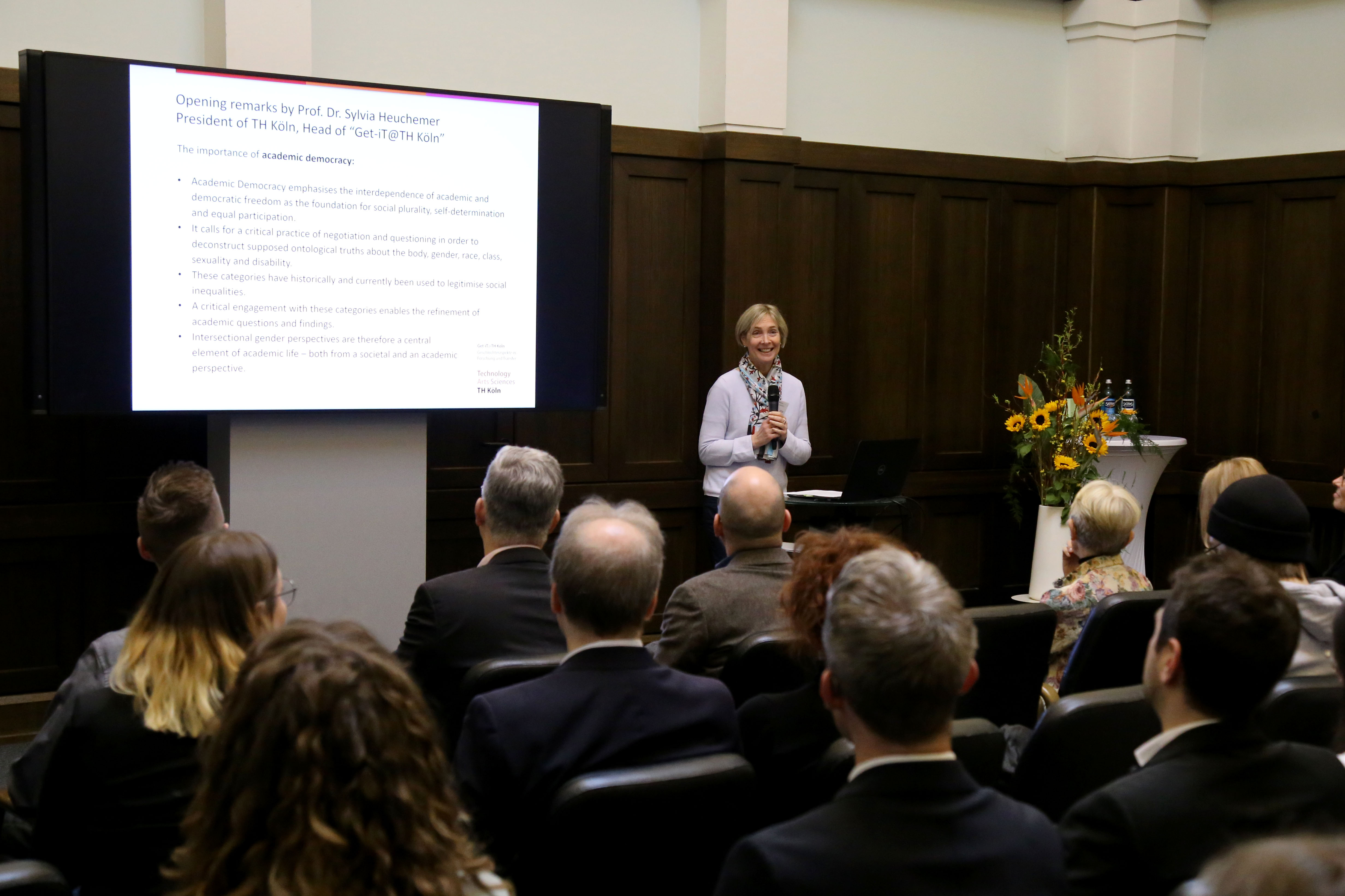 Die Verleihung, bei der Wissenschaftler*innen aller zwölf Fakultäten sowie Interessierte aus verschiedenen Einrichtungen der TH Köln sowie aus anderen Hochschulen anwesend waren, begann mit den einleitenden Worten von Prof. Dr. Sylvia Heuchemer. In ihrem Grußwort fokussierte die Präsidentin auf die Funktion der TH Köln als zivilgesellschaftliche Akteurin, die u. a. mit dem Projekt Get-iT@TH Köln ein sichtbares Zeichen dafür setzt, gesellschaftlichen Wandel mitgestalten zu wollen.