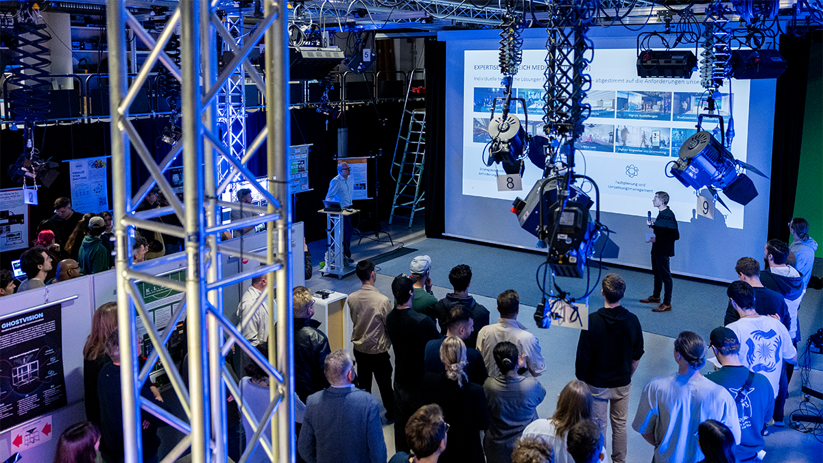 Die Bandbreite der diesjährigen Projekte zeigte eindrucksvoll, wie vielseitig der Studiengang Medientechnologie ist. Neben Kurzfilmen, die auf Basis von Künstlicher Intelligenz entstanden sind, und Systemen zur Analyse von Tischfußball oder Tennis, begeisterte vor allem auch das Projekt „GhostVision“ die Anwesenden und wurde dementsprechend mit dem Best Project Award ausgezeichnet. Das Projektteam hat neue Wege der immersiven Kommunikation erforscht und ein System entwickelt, das im Gegensatz zu klassischen Videokonferenzlösungen eine Projektion zeigt, die Dreidimensionalität vermittelt und es dadurch ermöglicht, Gesprächspartner*innen aus unterschiedlichen Blickwinkeln wahrzunehmen.
