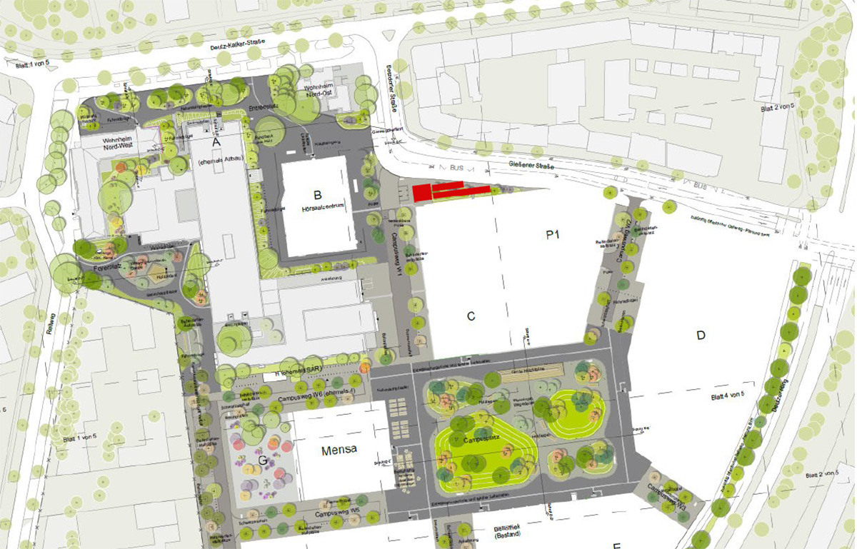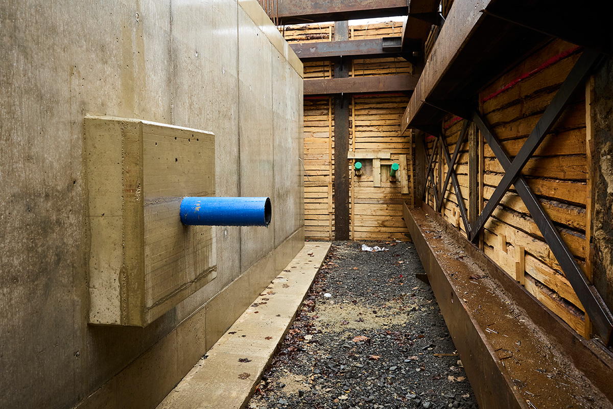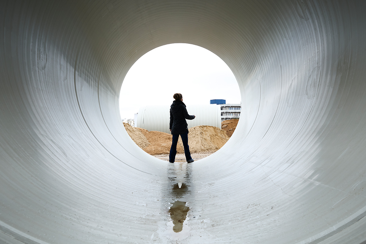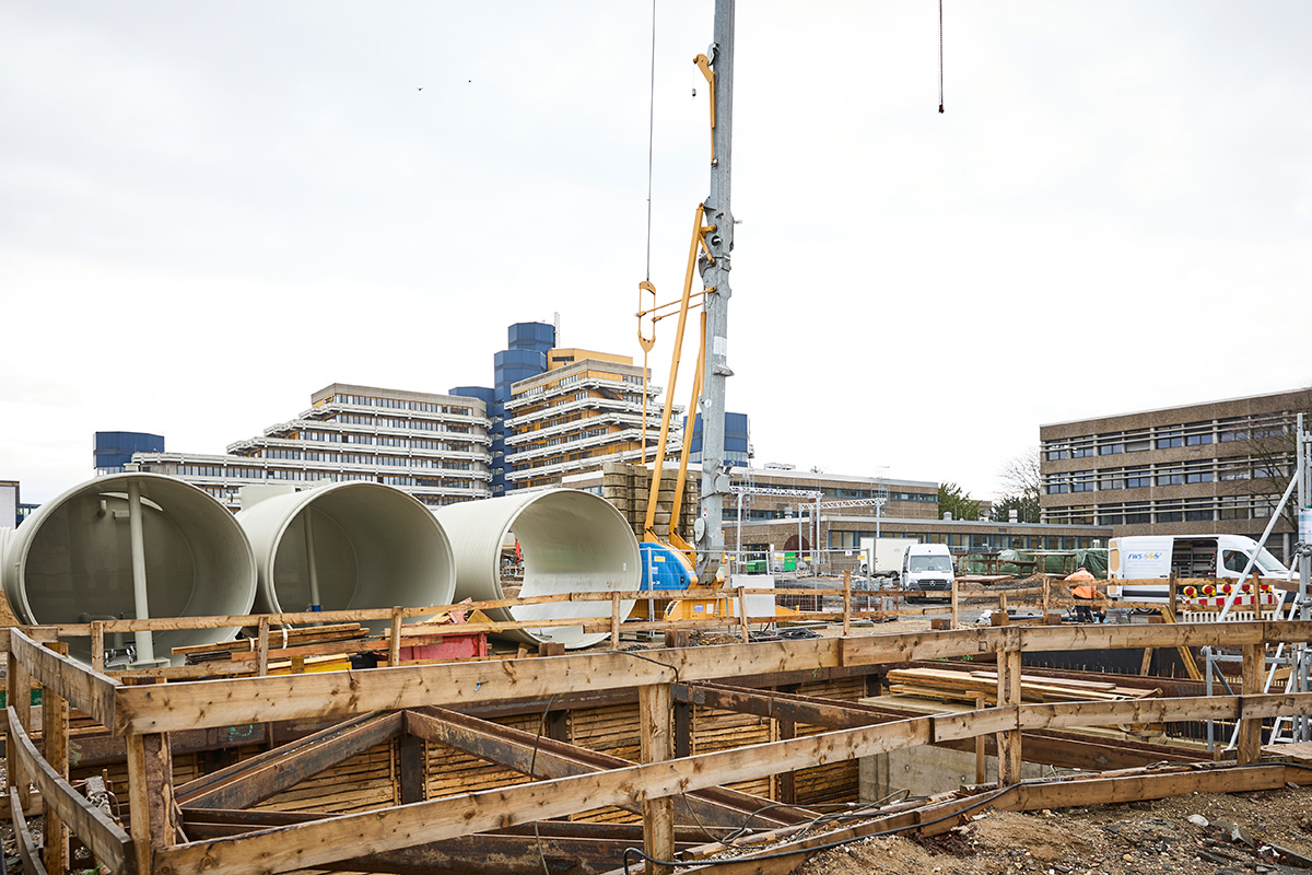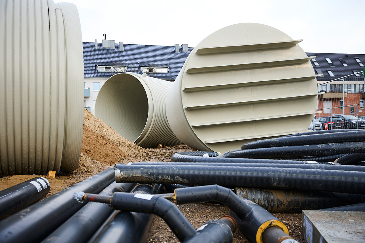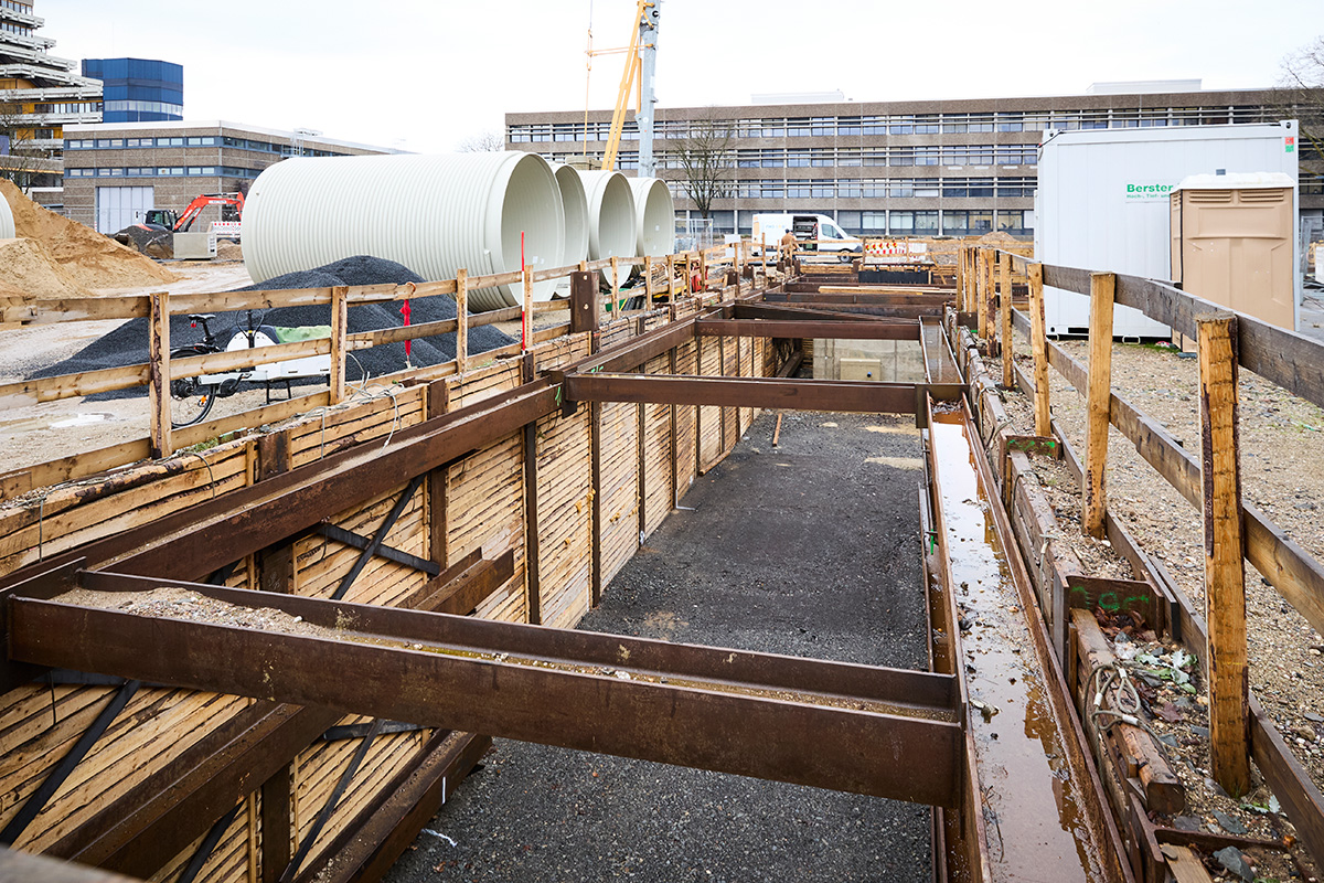 Die Kunststoff-Rohre haben einen Durchmesser von drei Metern. Sie wurden in dafür vorbereitete Schächte eingelassen und miteinander verschweißt. So ergeben sich zwei große unterirdische Löschwassertanks – der eine neun Meter, der andere 27 Meter lang. Insgesamt fassen sie 250 Kubikmeter Löschwasser. Die Löschwasserleitung führt unterirdisch durch den gesamten Campus und kann im Notfall angezapft werden. Parallel dazu verläuft eine Trinkwasserleitung, die den Campus mit Frischwasser versorgt – die Leitung speist sich aus der städtischen Trinkwasserversorgung.