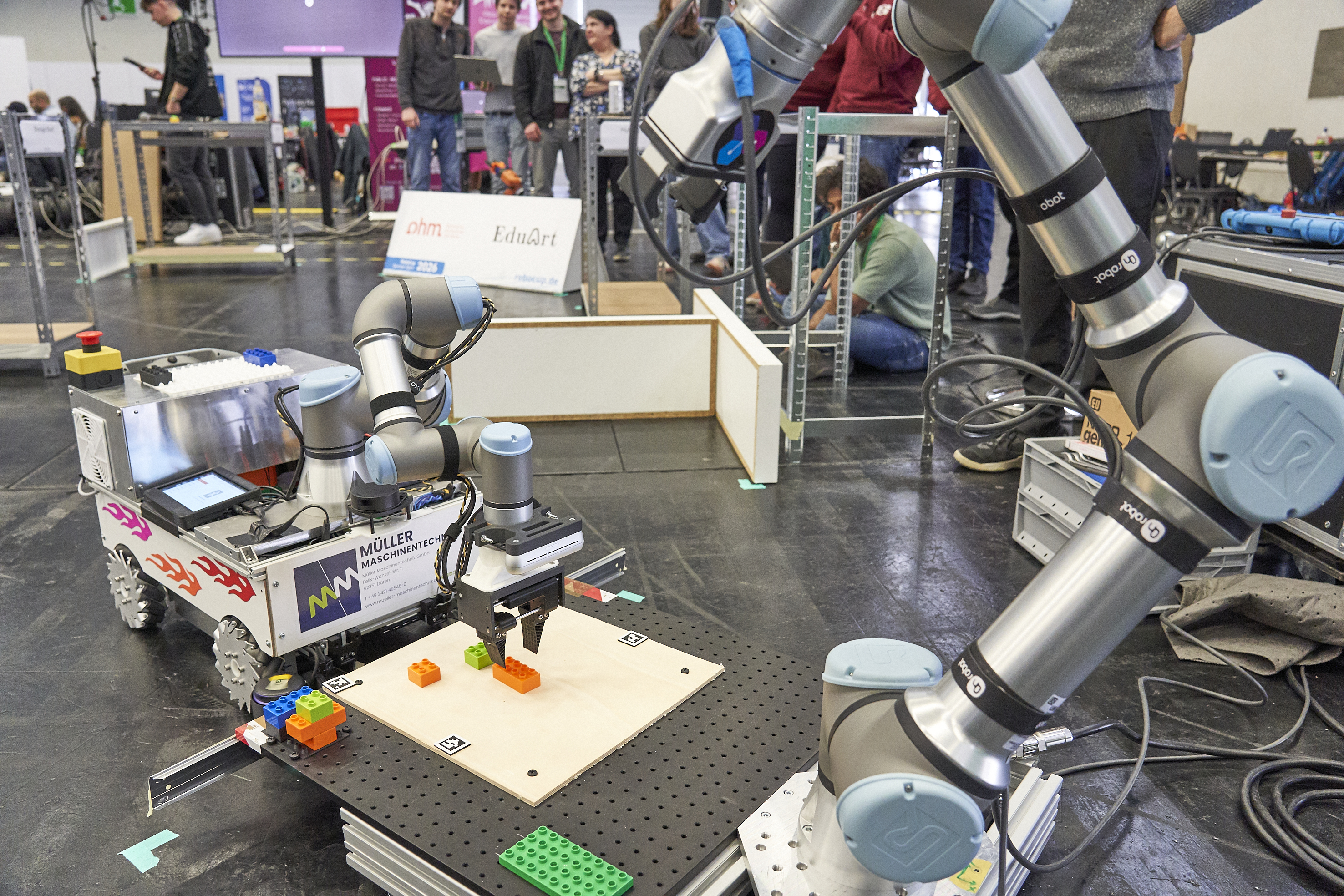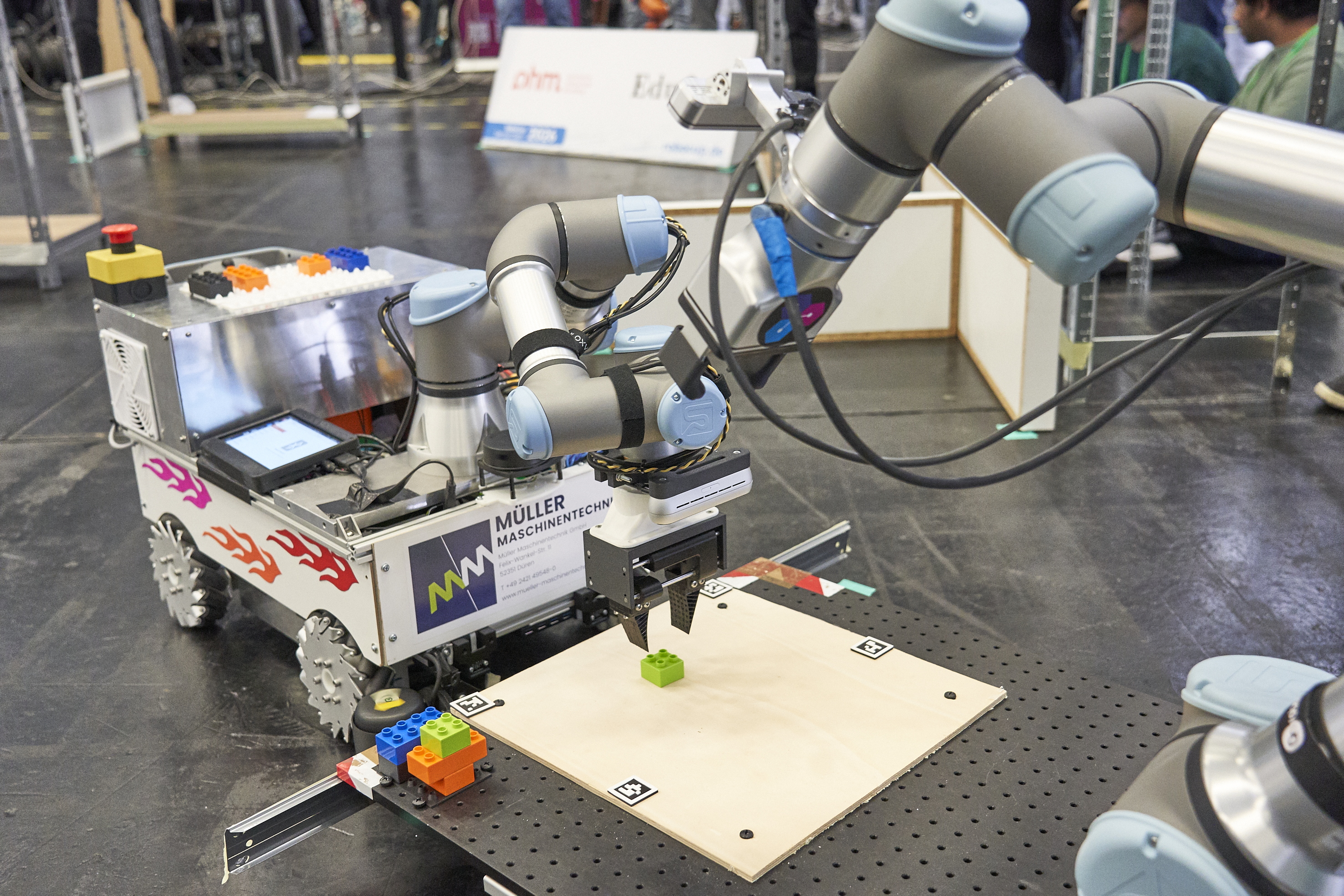 Die Smart Manufacturing League ist die industrielle RoboCup-Liga, bei der autonome Roboter typische Aufgaben aus Produktionsumgebungen erfüllen müssen. Die mobilen Roboter lokalisieren verschiedene Bauteile in einer Arena und bringen sie zu einer Montagestation. Dort werden automatisiert Beispielprodukte zusammengebaut und zum „Kunden“ ausgeliefert. Alte Produkte werden zurückgenommen, demontiert und die Einzelteile eingelagert. Da in diesem Jahr zum ersten Mal Aufgaben rund um die Montage von Bauteilen zu bewältigen waren, wurde mit einfach zu handhabenden, verschieden farbigen Duplobausteinen gearbeitet. Das Team der TH Köln war das einzige, das bereits zu Beginn der German Open auf das Handling von Bausteinen vorbereitet war.