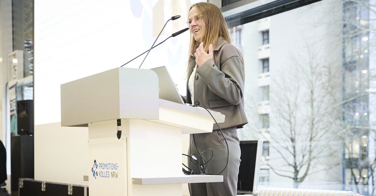 Dr. Eva-Maria Grommes, Forschungsgruppenleiterin der TH Köln und Wissenschaftskommunikatorin, blickte in einem unterhaltsamen Science Slam auf die Promotionszeit zurück. Kreativ und anschaulich schilderte sie dabei die besonderen Leistungen und Herausforderungen dieser Zeit, was nicht nur die Absolvent*innen des PK NRW begeisterte.