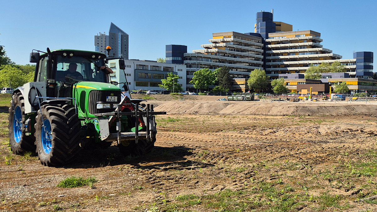 In einem Feldversuch auf einem Gelände neben dem Campus Deutz (im Hintergrund) testete das Projektteam die Unterschiede zwischen einer Bodenprobe und dem realen Boden. (Bild: TH Köln)