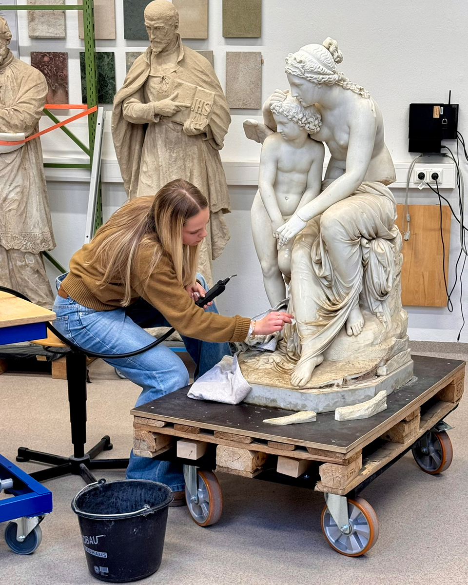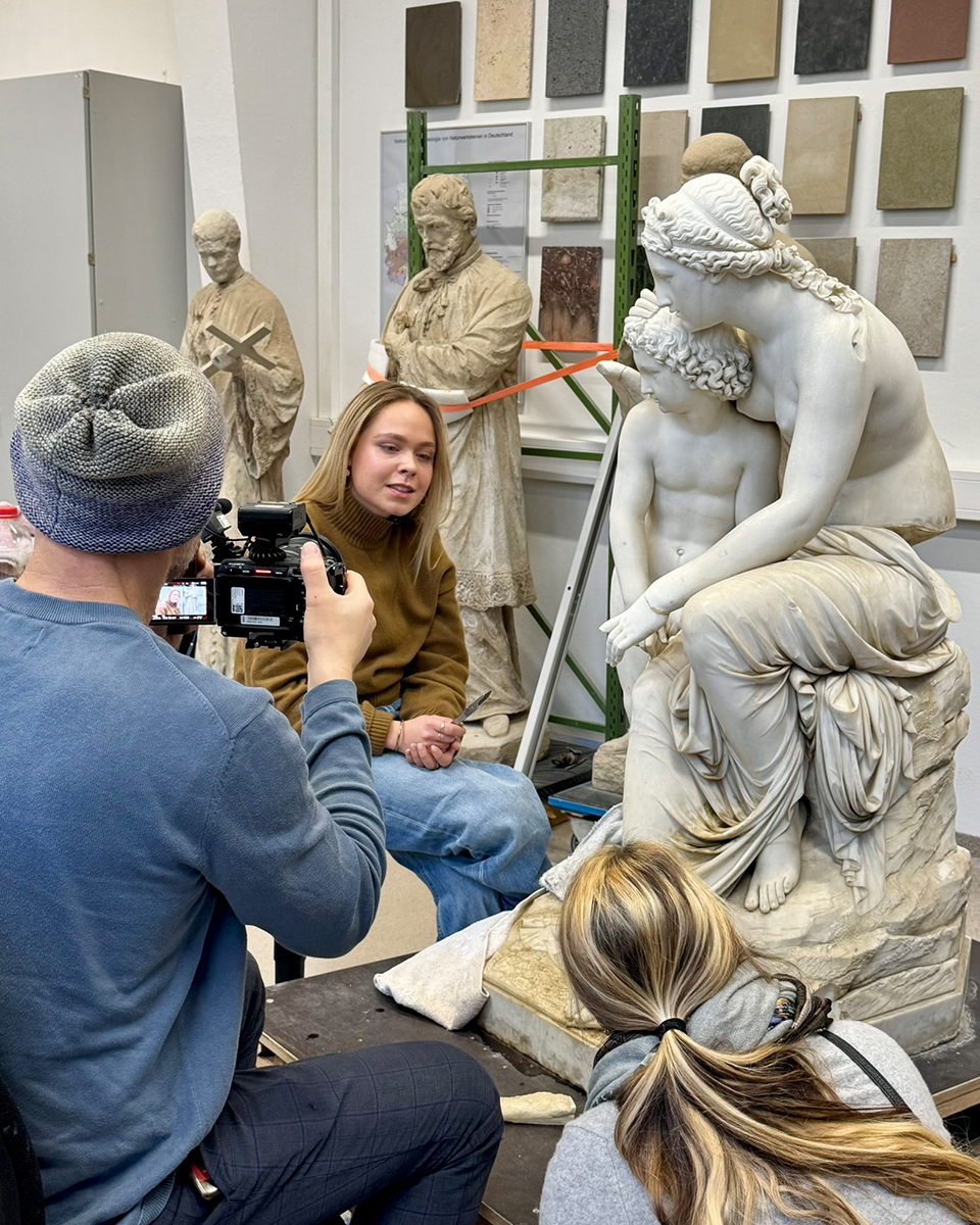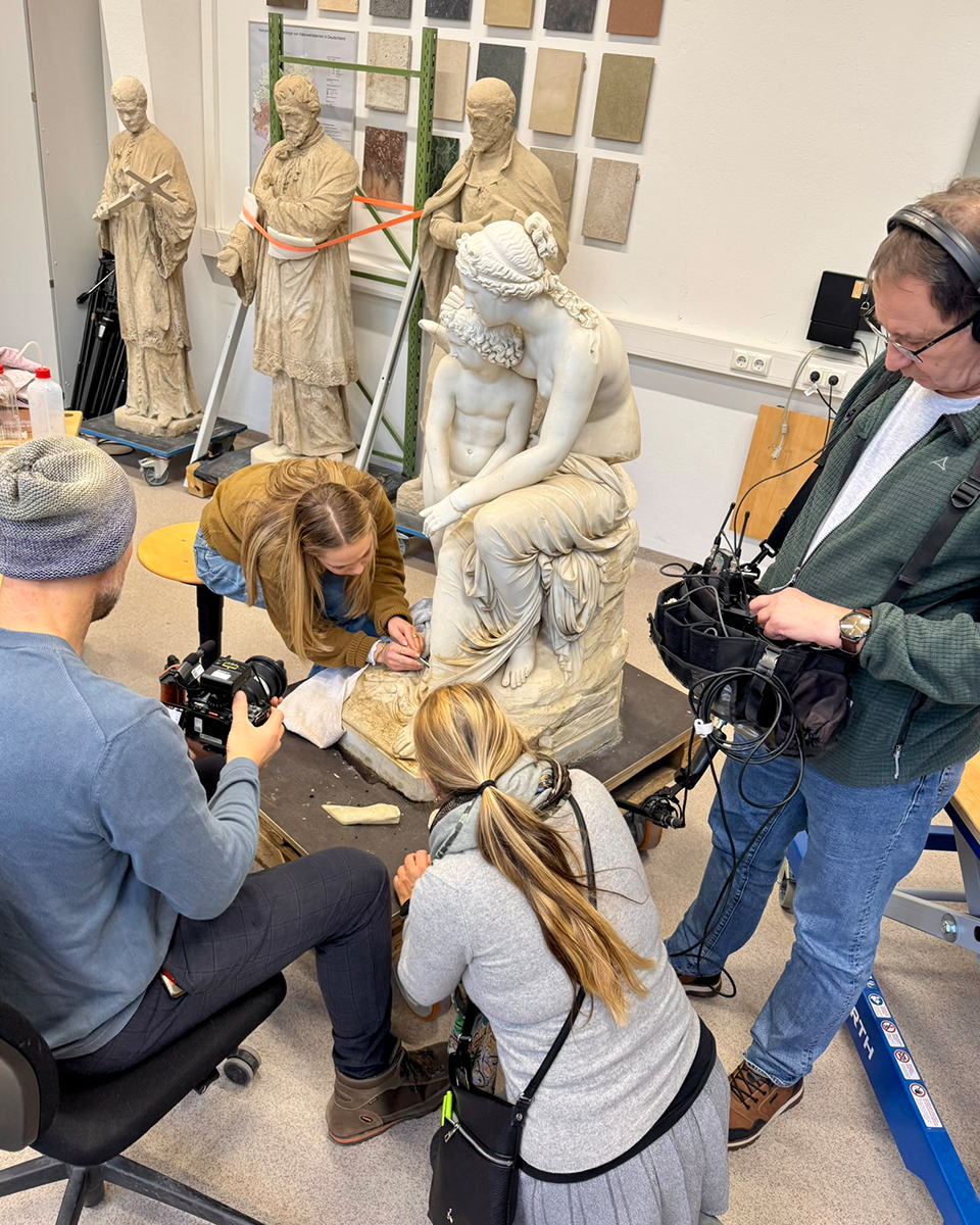 Am 16.12.2025 war ein Team der WDR Lokalzeit zu Besuch in der Steinwerkstatt, um über das Restaurierungsprojekt "Venus und Amor" zu berichten. Die Skulpturengruppe wurde 1863 von dem Kölner Bildhauer Anton Werres geschaffen und hat ihren Aufstellungsort im Botanischen Garten in Köln.