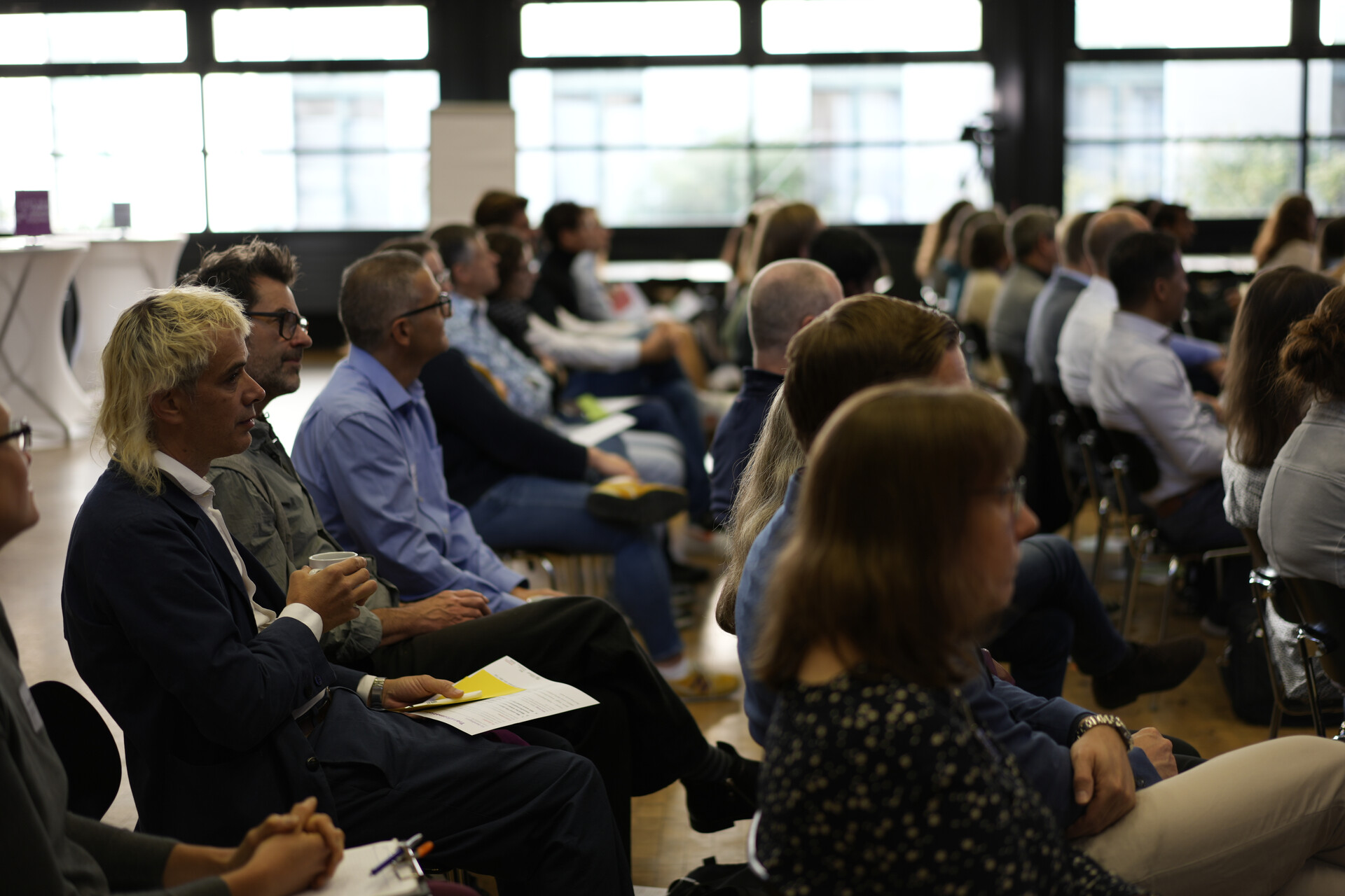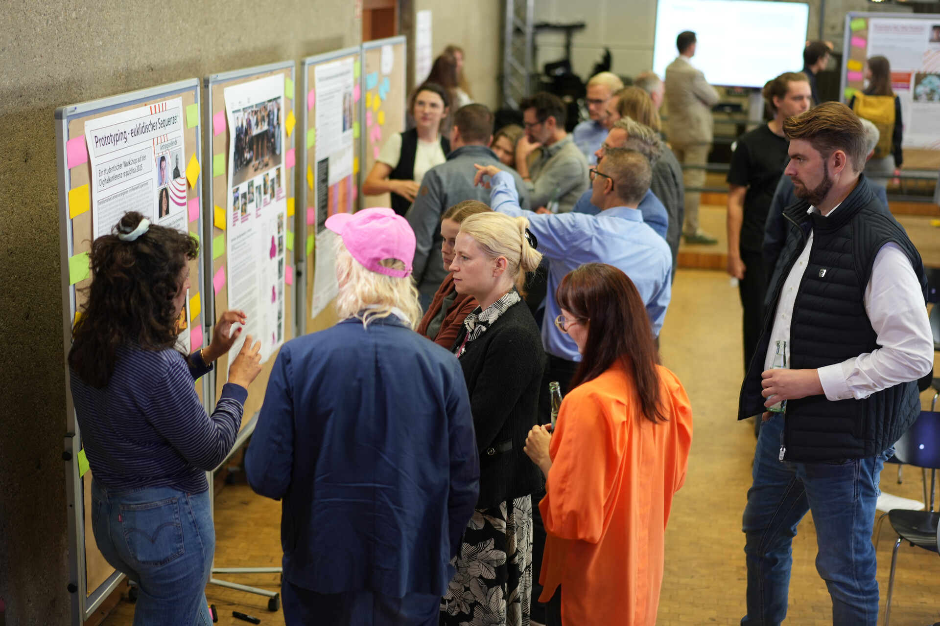 Rund um den Karl-Schüssler-Saal entwickelten die Teilnehmer*innen einen dynamischen Denkraum. Beim Barcamp beschritten sie selbst den Weg: Teilnehmende setzten ihre eigenen Themen wie Demokratiebildung, Wissenschaftliches Schreiben mit KI, die Verbindung von Wissenschaftlicher Weiterbildung, sowie die Verbindung von Lehre und Forschung in den Fokus und arbeiteten diese gemeinsam aus. Anschließend wurden die gewonnenen Eindrücke im Plenum zusammengetragen. Die Anwesenden hoben die Perspektivenerweiterung, die durch den Austausch von verschiedenen Fachrichtungen erzielt wird, als besonders positiv hervor. Themen wie die Umsetzung anwendungsorientierter Lehre und der Mehrwert transformativen Lernens für Studierende konnten sowohl im Barcamp als auch im Plenum rege diskutiert werden.