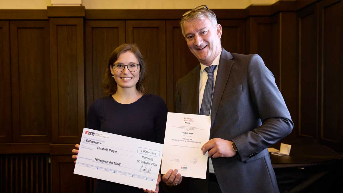 Peter Dümpelmann (DANV) überreicht Alissa Junker den Förderpreis der Deutschen Anwalt- und Notar-Versicherung im Rahmen der Absolvent:innen-Feier des Masterstudiengangs Versicherungsrecht LL.M. an der TH Köln. (Bild: ivwKöln)