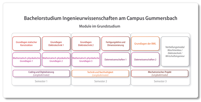 Die Inhalte im Grundstudium sind Grundlagen des Ingenieurwesens, der BWL, der Mathe und Physik sowie der Datenwissenschaften, aufteilt in die 7-wöchigen Module. In den Langläufermodulen lernst du:
