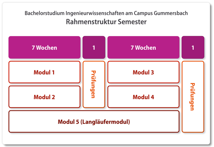 Ein Semester ist in zwei Teile von jeweils 7 Wochen aufgeteilt. Zwischen beiden Teilen ist eine Woche Pause, d.h. das Modul wird dann direkt im Anschluss geprüft. Dann folgt über die nächsten 7 Wochen ein weiteres Modul, das ebenfalls geprüft wird. So ergibt sich die "7+1+7 Struktur". Hinzu kommt ein sogenanntes Langläufermodul, das von Semesterbeginn 15 Wochen verläuft und im Anschluss geprüft wird.