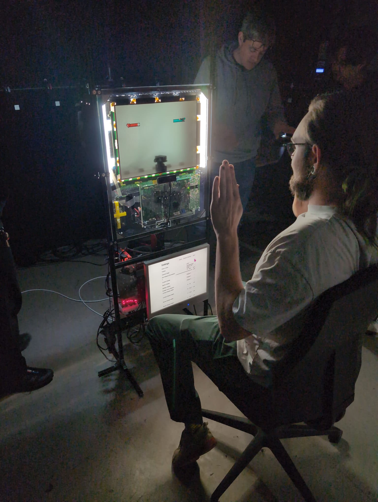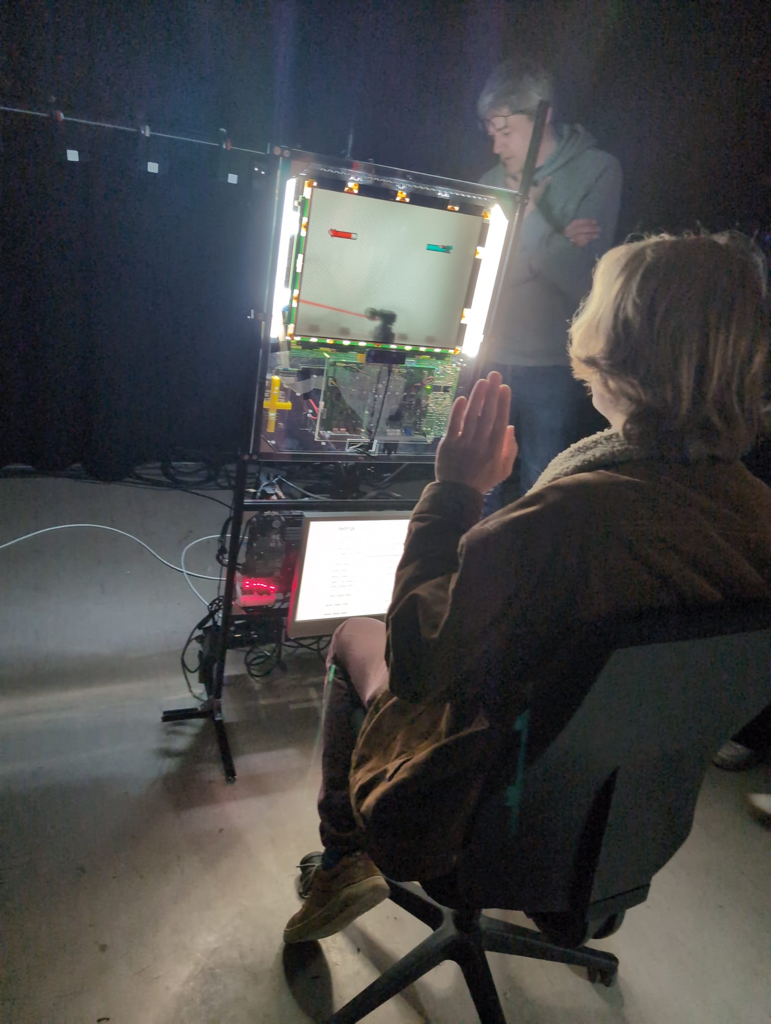 Die technische Umsetzung wurde in einer spielerischen Demo-Anwendung gebündelt: Hinter dem Display befindet sich eine bewegliche Kanone, die virtuelle Laserstrahlen auf die spielende Person richtet. Durch Kopfbewegungen kann den Angriffen ausgewichen werden, während Handbewegungen zusätzliche Interaktionen ermöglichen, indem Laserstrahlen mit den Händen auf die Kanone zurückgelenkt werden können. Ergänzend wird das System durch räumliches