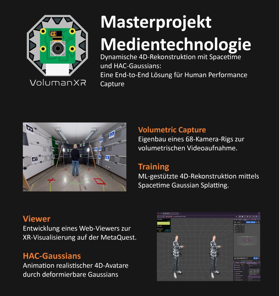 Im Rahmen des Masterprojekts im Studiengang Medientechnologie an der TH Köln wurde unter dem Titel VolumanXR eine vollständige Pipeline für volumetrische Videoaufnahmen entwickelt. Das Projekt umfasste vier Subteams mit folgenden Aufgaben: