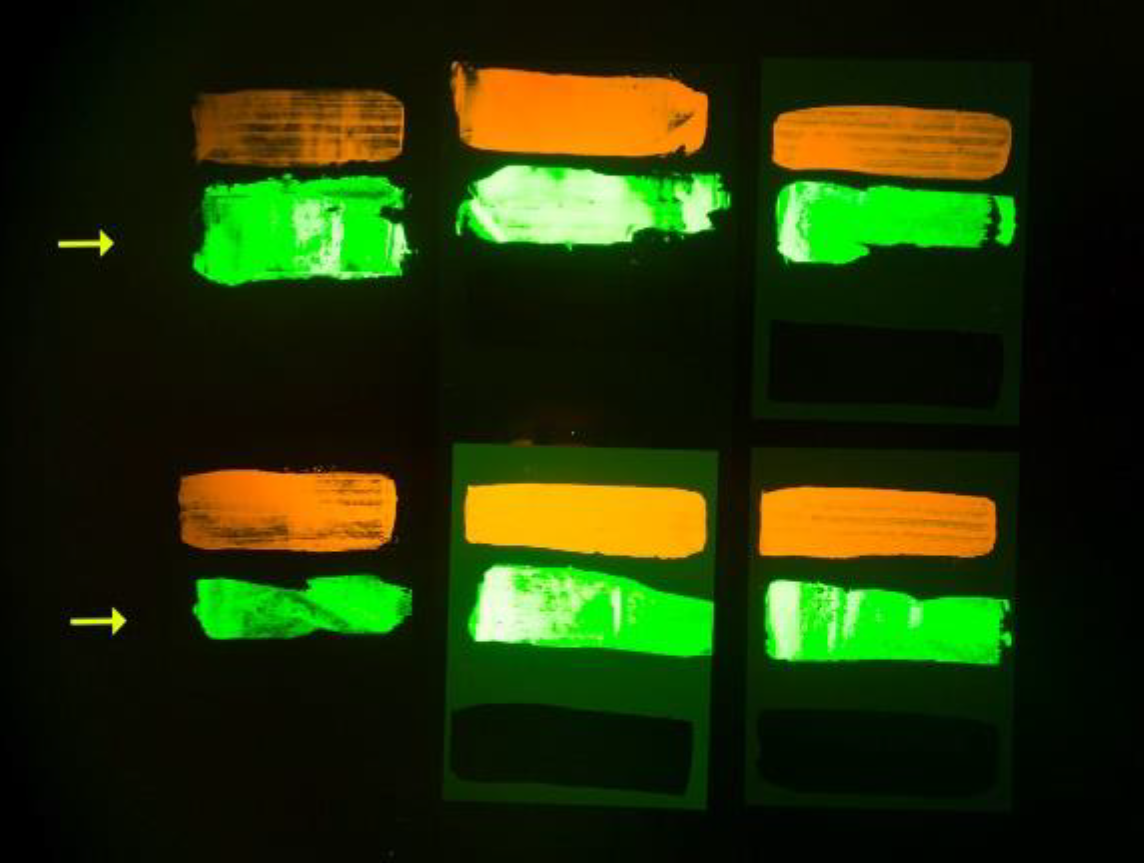 Verschiedene Druckfarben unter UV-Strahlung (320-400 nm) durch den Bandpassfilter 550 nm. Die Pfeile markieren die gelbe Tagesleuchtfarbe. (Bild: Anna Meisen)