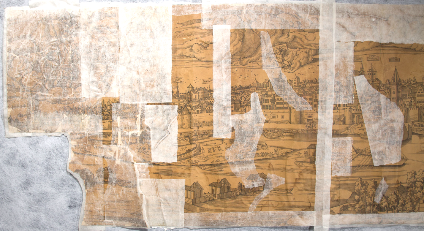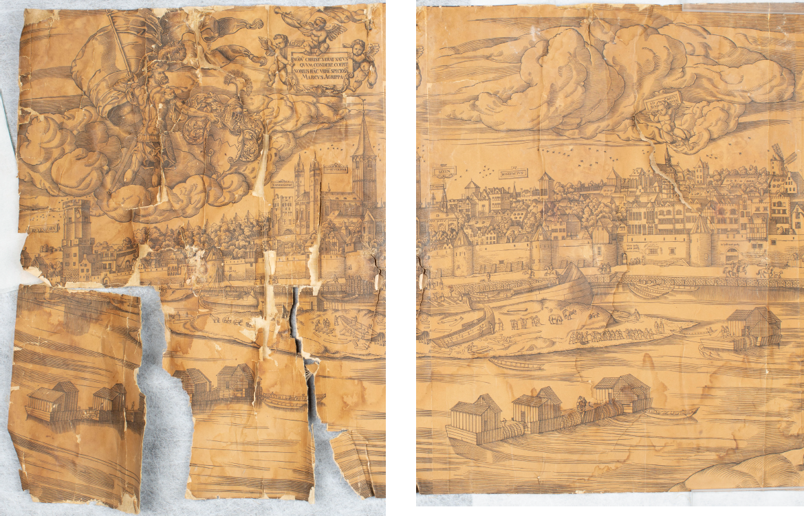 Eine großformatige Ansicht der Stadt Köln, die aus aneinandergeklebten Einzelblättern besteht, sollte zur Entfernung von Schwemmrändern wässrig gereinigt werden. Der Schwerpunkt lag darauf, eine Methode zu finden, die auf eine Trennung der Einzelblätter verzichtet. Dazu wurden Reinigungsmethoden mit wässrigen Gelen sowie Kapillarvliesen in Bezug auf die Durchführung an Großformaten evaluiert.
