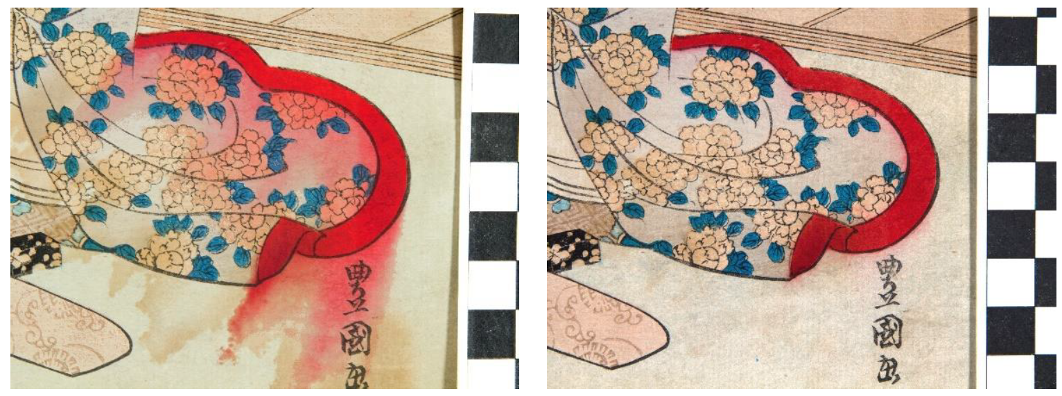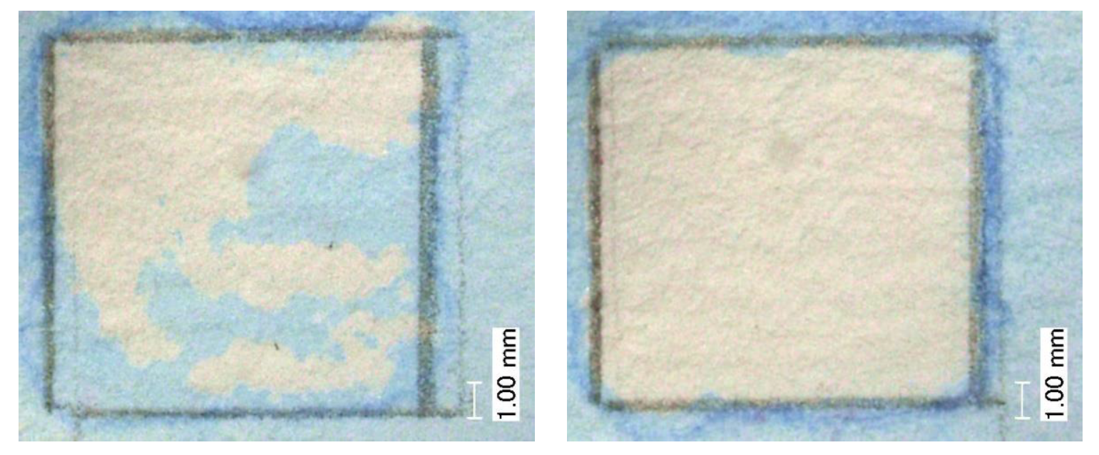 Modernes Büttenpapier nach Menthol-Auftrag und Wässerung. Während beim einfachem Auftrag (links) Wasser in das Testfeld eindringen konnte, ist das Testfeld nach zweifachem Auftrag (rechts) vollständig hydrophobiert (Bild: Maike Linden)