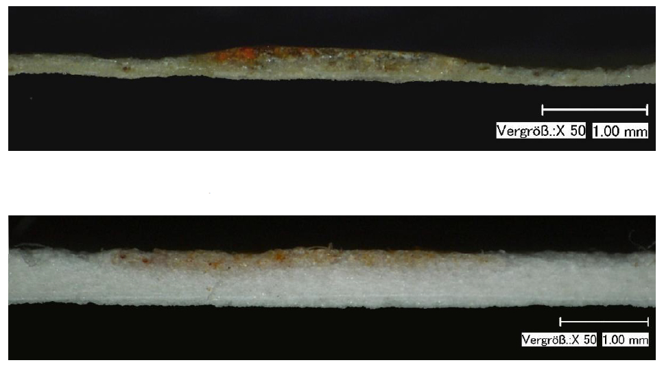 Querschnitt historisches Bütten (oben); die Menthol-Schmelze drinkt zu etwas zwei Dritteln in das Papier. Querschnitt modernes Bütten (unten); die Menthol-Schmelze dringt zu etwa einem Drittel in das Papier ein. (Bild: Maike Linden)