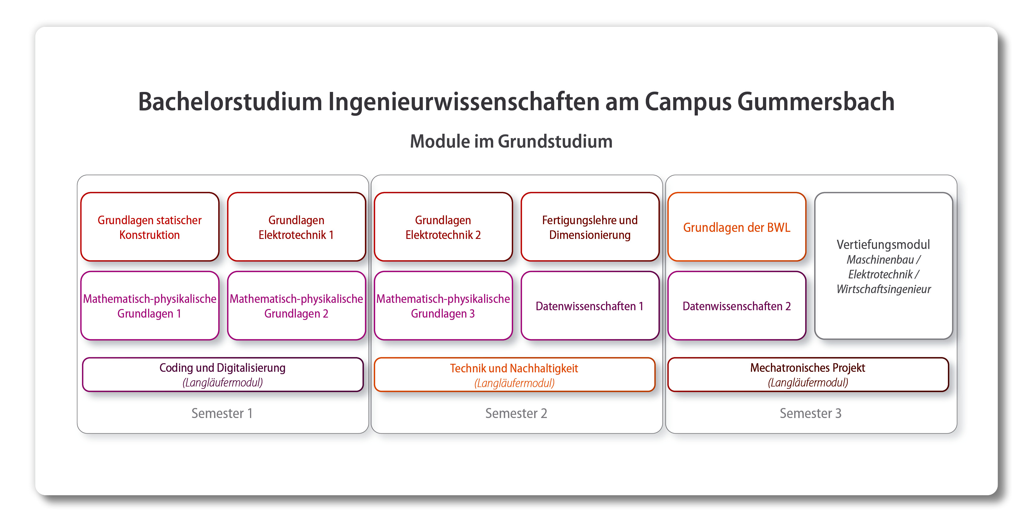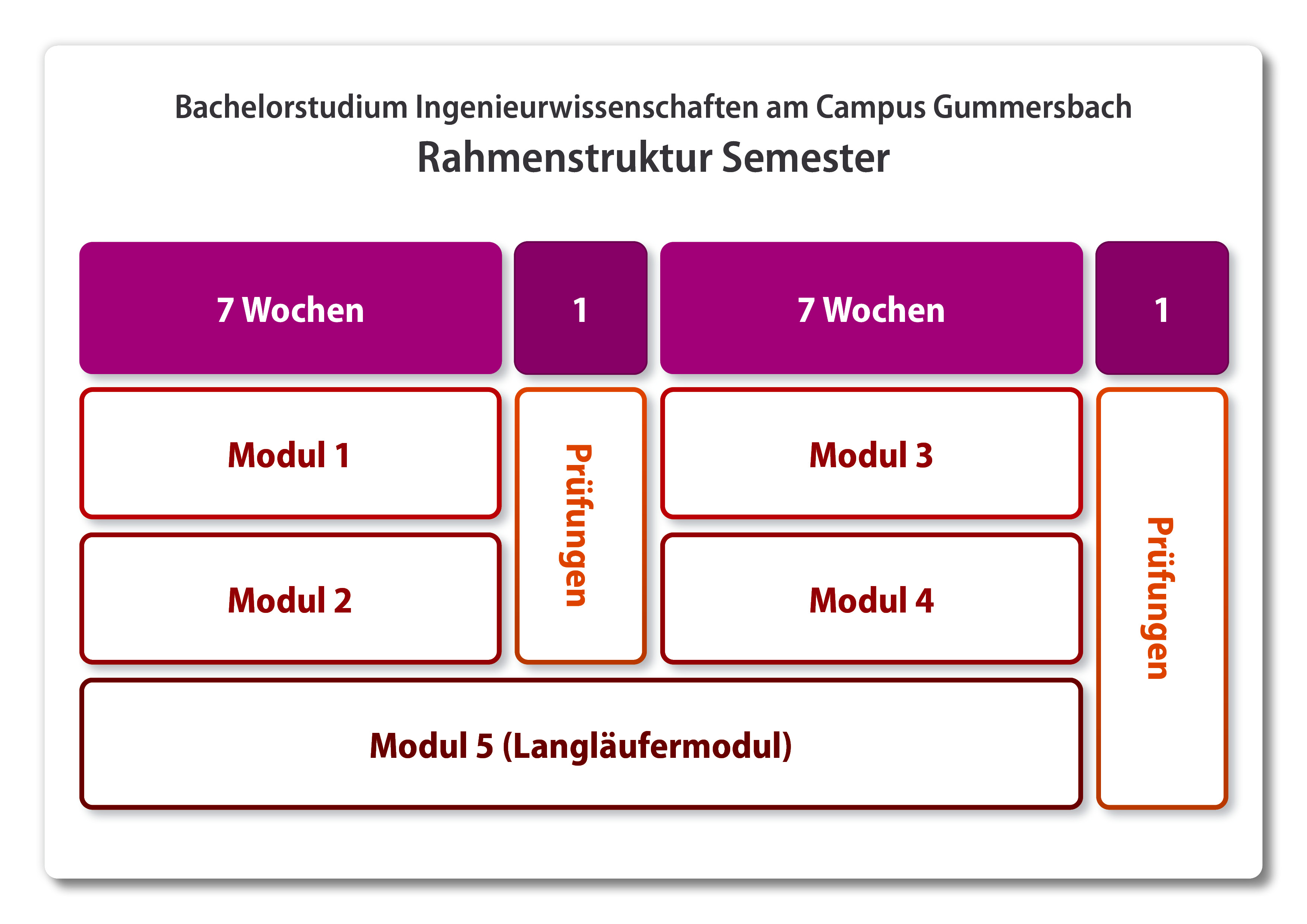 Hinzu kommt pro Semester ein sogenanntes Langläufermodul, das von Semesterbeginn 15 Wochen verläuft und im Anschluss geprüft wird.