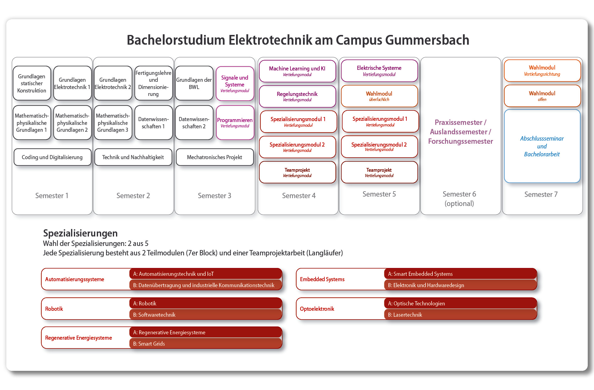 In der Mitte des 3. Semesters wählst du zwei der fünf Spezialisierungen aus. Jede Spezialisierung besteht aus 2 Teilmodulen (7er Block) und einer Teamprojektarbeit (Langläufer):